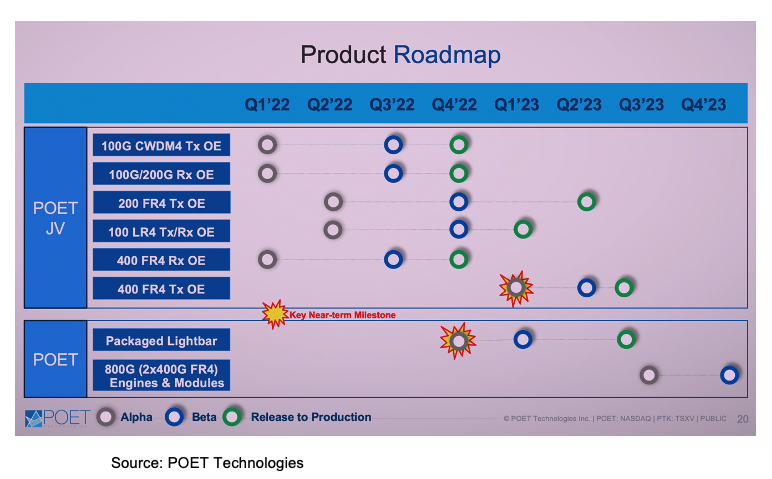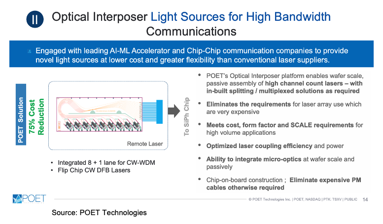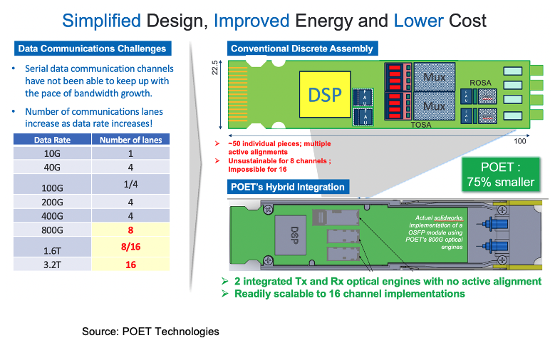 1. POET now considers its 100G, 200G, and 400G solutions legacy products that are mostly being handled by its joint venture and it is now only getting involved if certain custom work is needed. It has set its sights on higher-end technology and faster speeds of 800G, 1.6T, and 3.2T. Its solution is not only space-saving, allowing it to create transceiver pluggables at 800G and 1.6T, but its efficient design, eliminating wire bonds reduces noise. Noise is just as important as size in this market and lower noise allows the use of lower-powered lasers again reducing power consumption and laser costs. Because the POET design has mux and demux capabilities it reduces the steps in the light transfer and thus the wires connecting making it far more efficient while reducing the need for active alignment. The final step in its elegant design is working with fiber optics suppliers to on a way to connect to the fiber without active alignment.
