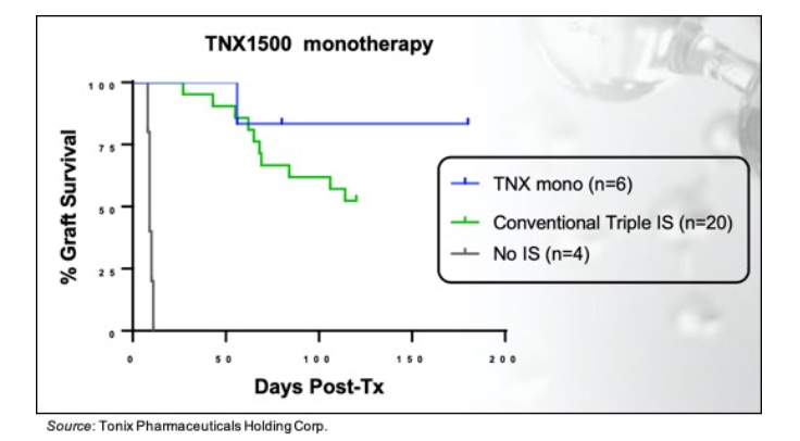 For the kidney allo-transplantation study in NHPs, TNX-1500 was dosed at 20 mg/kg on days 0, 2, 7 and then weekly until day 180. The following chart shows that of the six recipients, no rejection was observed in five of them. This compares to treatment with conventional immunosuppressive therapy, in which 10 of 20 recipients showed organ rejection by day 120. The four recipients that did not receive any therapy all rejected the organ within a few days.