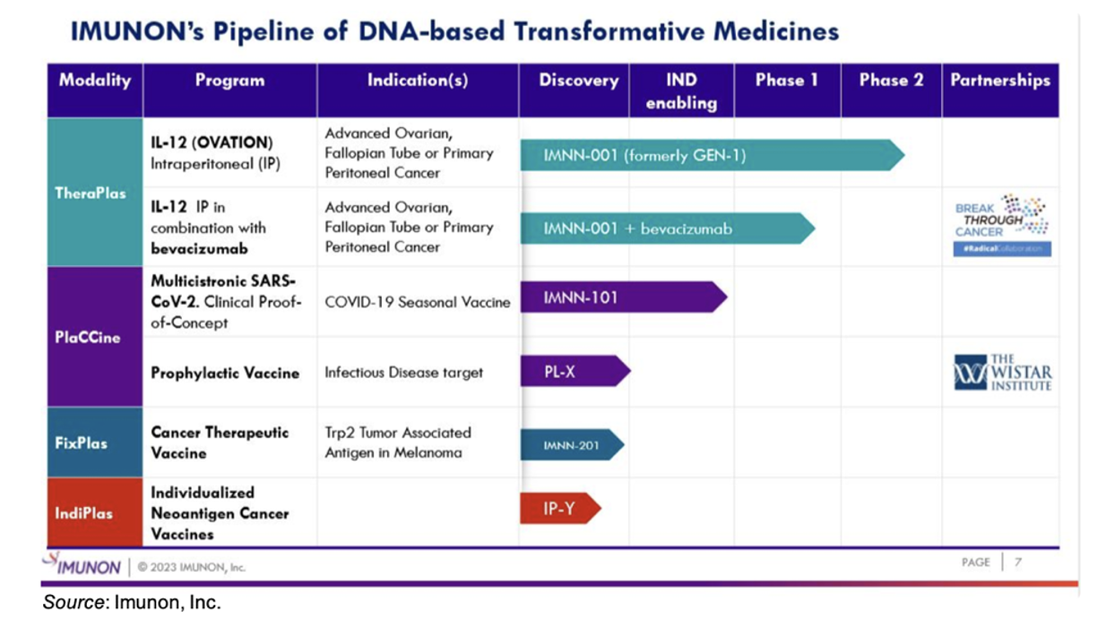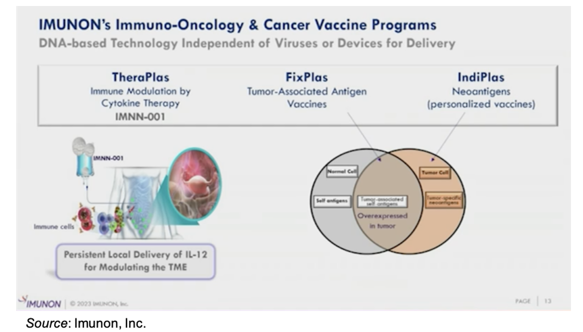 Imunon’s IO technology consists of three separate platforms: TheraPlas, which involves immune modulation by cytokine therapy; FixPlas, which is a cancer vaccine that targets tumor associated antigens; and IndiPlas, which is a personalized cancer vaccine that targets neoantigens.