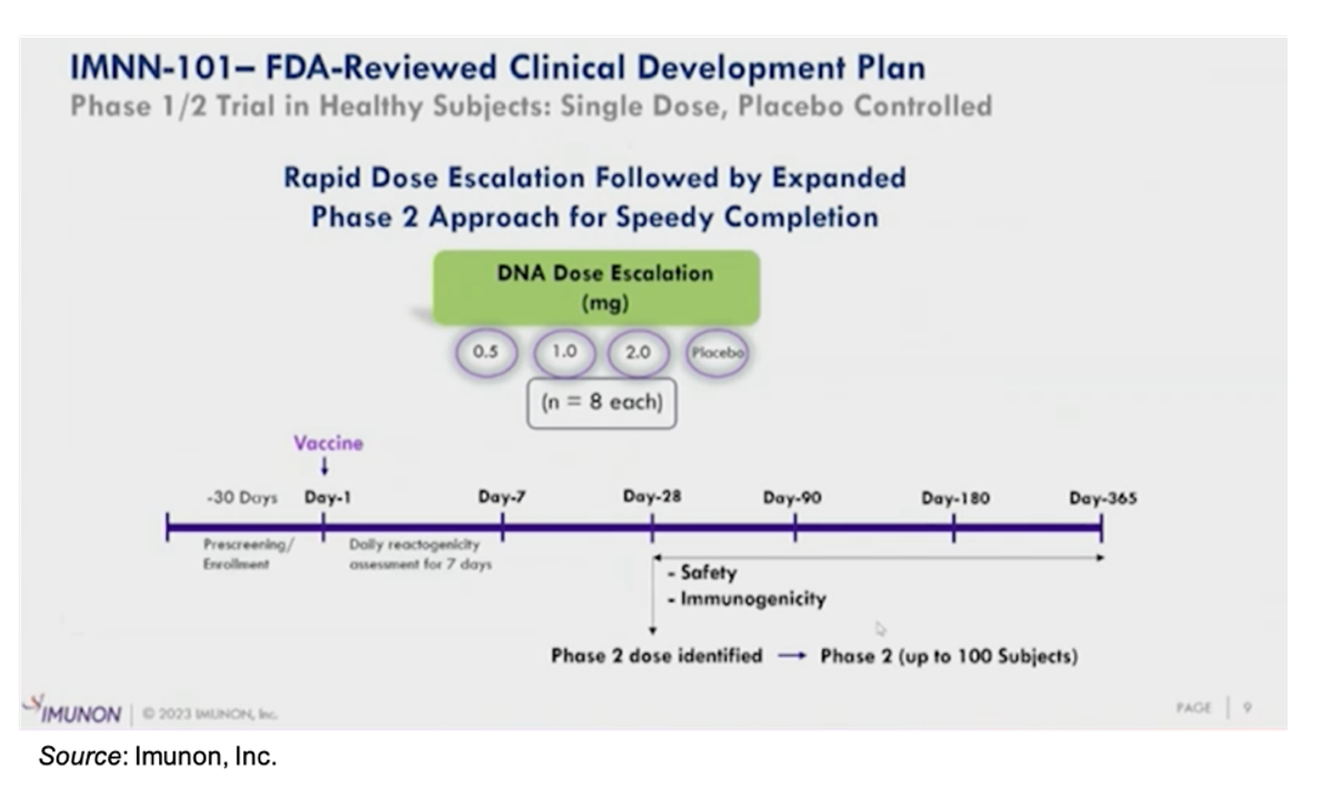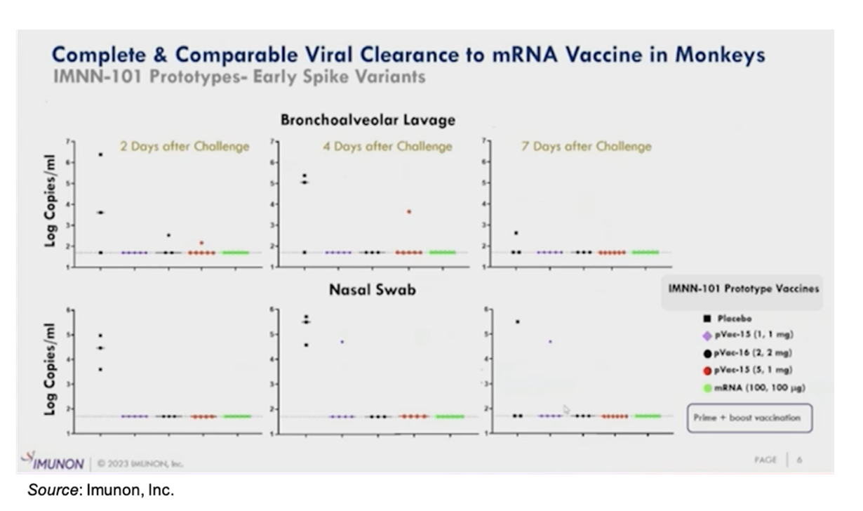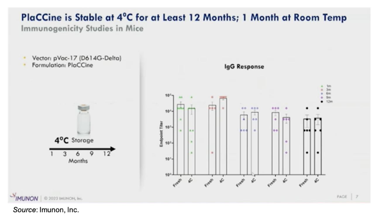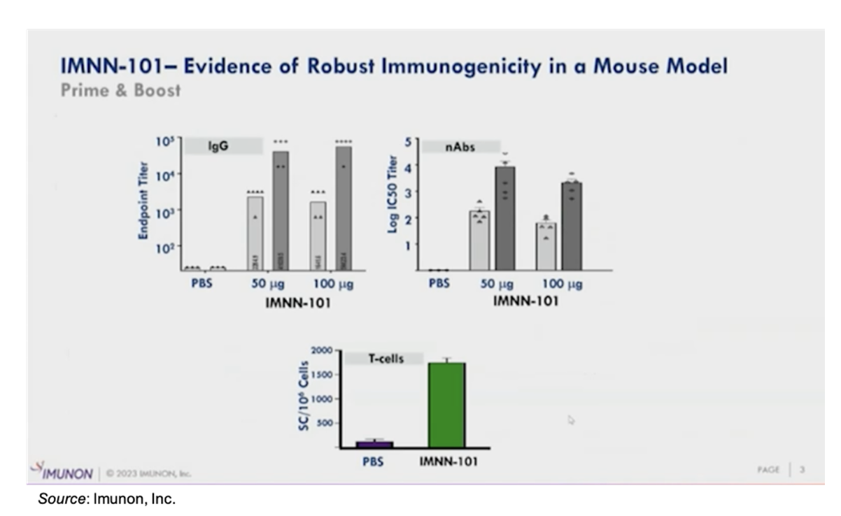 IMNN-101 is the company’s seasonal COVID-19 vaccine candidate that is derived from the PlaCCine platform. It is a DNA vaccine that addresses a number of limitations of current vaccines, including the durability of antigen expression, stability, and flexibility to adapt to mutating viruses. The company has generated pre-clinical data showing robust immunogenicity in mice and complete viral clearance in non-human primates. The following slide shows a robust IgG response, high levels of neutralizing antibody levels, and the T cell response following a prime and boost administration schedule.