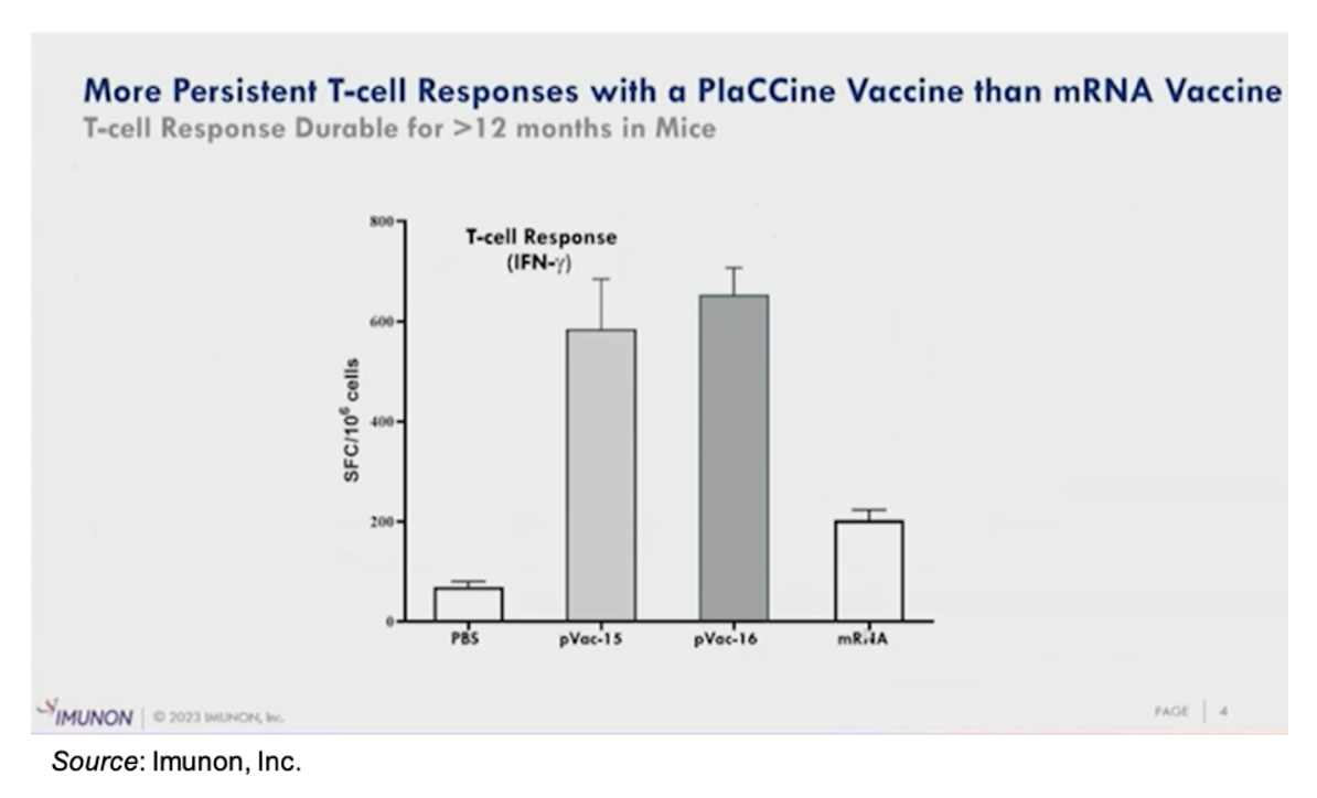 In contrast to the currently approved mRNA vaccines, the following slide shows that the T cell response for the company’s DNA vaccines is more durable. pVac-15 and pVac-16 are two different formulations of IMNN-101 that target different variants of the SARS-CoV-2 virus. Both formulations result in a more robust T cell response than one of the commercially available mRNA Covid-19 vaccines 12 months following administration. This may be due to the persistence of the DNA vaccine compared to mRNA, which results in production of spike protein antigen and its exposure to the immune system for an extended period of time.