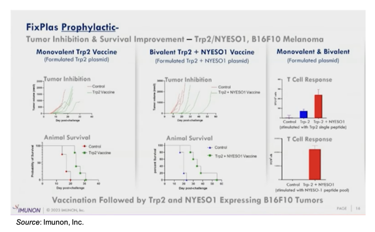 The FixPlas platform consists of a DNA vaccine that is designed to target tumor-associated antigens (TAAs) and can be utilized in both monovalent and bivalent format. The company has completed pre-clinical studies examining the FixPlas technology as a prophylactic in a mouse model of melanoma and is currently evaluating it as a therapeutic. The following slide shows results from the prophylactic study, in which the TAA Trp2 was evaluated both as a monovalent vaccine as well as a bivalent vaccine in combination with NYESO1. The results showed extended survival for animals immunized with the vaccine along with a strong T cell response.