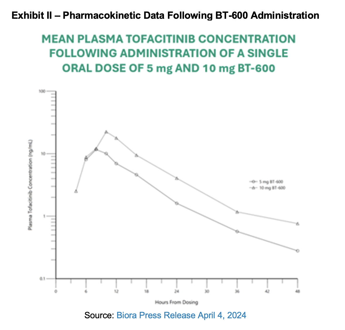 The MAD portion of the study began after the SAD and was conducted to confirm study results. Patients received one daily dose of 5 mg, 10 mg or placebo. The dose will be one-half the amount administered as per the drug label for tofacitinib. The MAD portion of the trial evaluated daily doses of BT-600 for seven days at 5 mg and 10 mg tofacitinib or placebo, in healthy adult participants. Results are expected to be shared with stakeholders in June 2024.