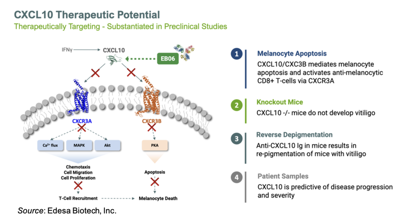 Edesa Biotech, Inc. (NASDAQ:EDSA) is planning for a Phase 2 study of its anti-CXCL10 monoclonal antibody for the treatment of moderate-to-severe non-segmental vitiligo patients. Vitiligo is a disease that causes areas of the skin to lose color, with non-segmental vitiligo being characterized by patches appearing on both sides of the body. It is caused when pigment-producing cells (melanocytes) die or stop producing melanin as a result of an autoimmune disease, genetics, or a triggering event (e.g., stress, sunburn, skin trauma).