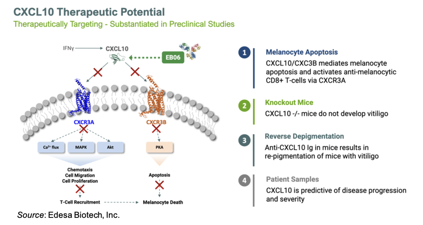 Edesa Biotech, Inc. (NASDAQ:EDSA) is planning for a Phase 2 study of EB06, its anti-CXCL10 monoclonal antibody, for the treatment of moderate-to-severe non-segmental vitiligo patients. Vitiligo is a disease that causes areas of the skin to lose color, with non-segmental vitiligo being characterized by patches appearing on both sides of the body. It is caused when pigment-producing cells (melanocytes) die or stop producing melanin as a result of an autoimmune disease, genetics, or a triggering event (e.g., stress, sunburn, skin trauma).