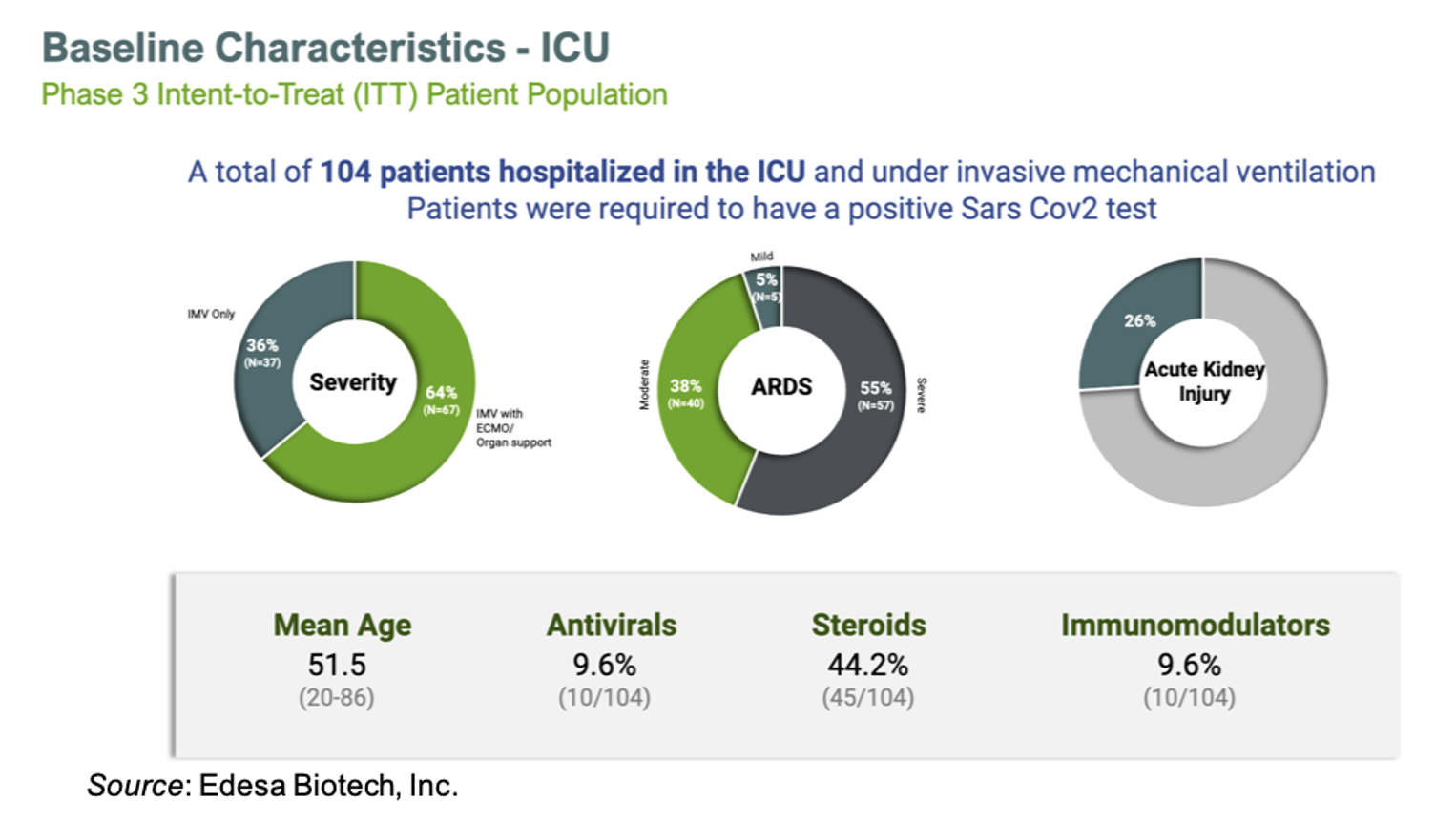 The Phase 3 trial of EB05 enrolled a total of 104 patients that were hospitalized in the ICU, receiving invasive mechanical ventilation (IMV), and had a positive SARS-CoV-2 test. The baseline characteristics of the intent-to-treat population is given below. The majority of patients were receiving IMV with ECMO/organ support, had severe ARDS, and over a quarter of them had acute kidney injury.