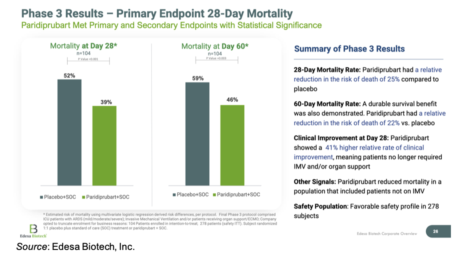 In October 2025, Edesa announced positive results from the Phase 3 trial evaluating paridiprubart (EB05) in the treatment of acute respiratory distress syndrome (ARDS). ARDS is caused by an exaggerated immune response that leads to an unregulated inflammatory response in the body and ultimately injury to the lungs that results in oxygen deprivation. There are a number of different causes, including virus-induced pneumonia, smoke/chemical inhalation, sepsis, and chest injury. There are approximately 600,000 ARDS-related ICU admissions every year across the seven major markets (U.S., U.K., Germany, France, Spain, Italy, Japan, and Canada). There are currently few treatment options for moderate to severe ARDS aside from supplemental oxygen and mechanical ventilation. ARDS imposes a very high burden on the healthcare system, both in terms of cost (averages >$100,000 per patient in the U.S.) and a very high mortality rate.