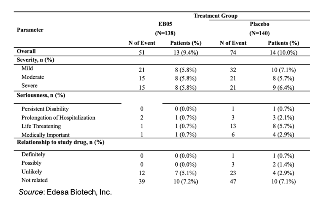 Lastly, EB05 has exhibited a very favorable safety profile. The following table shows the safety outcomes for the 278 patients in the safety database (n=138 EB05; n=140 placebo). There were no treatment-related adverse events observed, and the event profile between the two treatment groups was very similar. EB05 has been dosed in over 460 patients and healthy volunteers through its development, which supports its favorable safety profile.