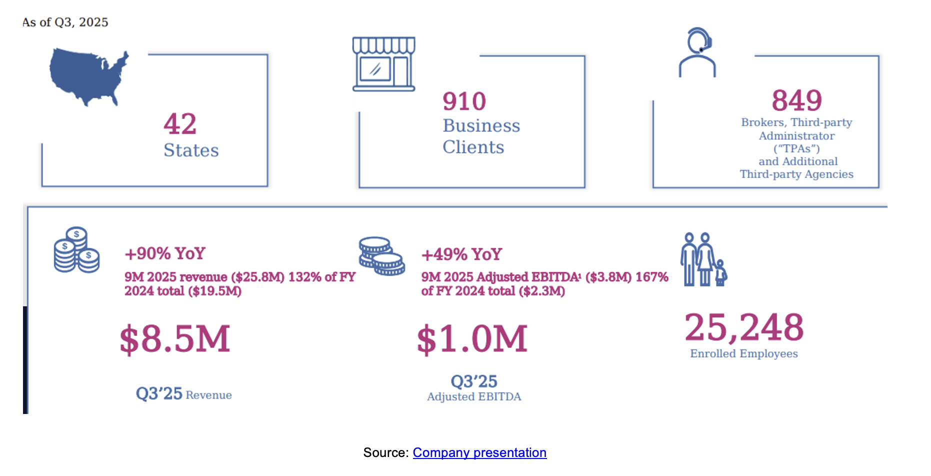 Revenue grew an impressive 90% year-over-year to $8.5 million, compared to $4.5 million in 3Q24. Cumulative revenue of $25.8 million in the first nine months of 2025 exceeds total full-year 2024 revenue of $19.5 million. Revenue growth is highly correlated with the number of enrolled employees (EEs) insured via its platform.