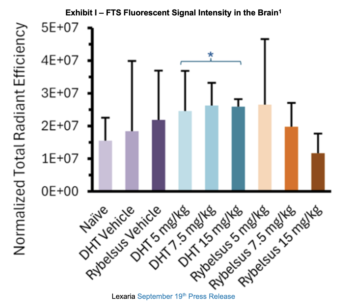 A September 19th press release shared results from the study. It noted that DHT-fluorescently tagged semaglutide (FTS) demonstrated a predominantly higher apparent trend in brain biodistribution than the Rybelsus equivalent composition and all study controls. The determination was made based on fluorescent signal intensity using whole brain imaging. Below, the DHT performance can be seen in the middle light blue, aqua and turquoise bars in the center of the exhibit.