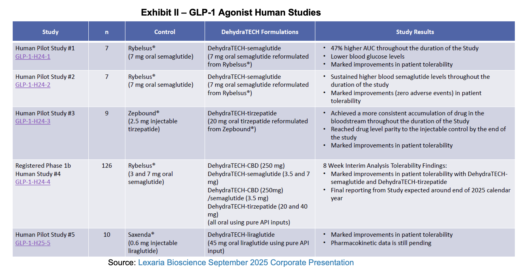 GLP-1-H24-4 was conducted with 24-25 overweight, obese, pre- or type 2 diabetic patients in each of the five study arms (n=126), of which 4 arms evaluated various DehydraTECH formulations with the 5th being the Study control arm. Arm 1 evaluated DHT-CBD, Arm 2, DHT-semaglutide and Arm 3, DHT-semaglutide and DHT-CBD. Arm 4 evaluated Rybelsus tablets and Arm 5 examined DHT-tirzepatide.