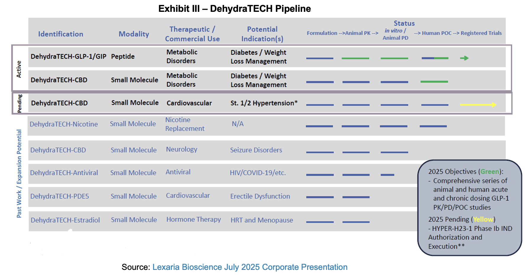 In the fall of 2023, Lexaria began its efforts to evaluate members of the GLP-1 agonist class formulated with DehydraTECH to determine if the new formulation could improve bioavailability, cost-effectiveness, tolerability, weight-loss potential, management of diabetes and other health conditions. Since then, the company has launched five human studies along with other non-human work to answer this question. Over the last two years, Lexaria has reported the data from these trials showing reduced levels of side effects, comparable levels of glucose reduction and insulin increase, less semaglutide necessary than in Rybelsus to achieve similar effects. In an August 6th press release, management penned a missive reviewing GLP-1 agonist market activity highlighting the primary players (Eli Lilly and Novo Nordisk), the number of drugs in development (39) and number of sponsors advancing them (34). The note from management also addressed the dealmaking environment around the class, underlining the collaboration between Novo Nordisk and Septerna, Roche’s asset acquisition from Zealand Pharma, Regeneron’s licensing deal with Hansoh Pharmaceuticals and Merck and Cyprumed, which we discussed in our previous report.