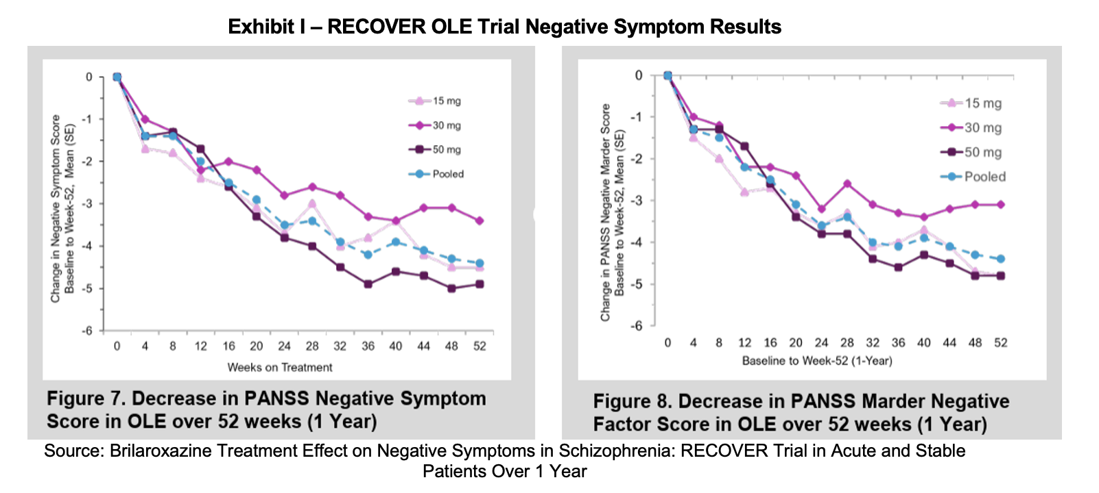 Reviva presented a poster at the CNS Summit in Boston, Massachusetts, in early November. The poster, entitled Brilaroxazine Treatment Effect on Negative Symptoms in Schizophrenia: RECOVER Trial in Acute and Stable Patients Over 1 Year examined brilaroxazine’s short and long-term effectiveness in addressing negative symptoms. Much of the poster reiterated RECOVER and RECOVER open label extension (OLE) data that had already been presented in other materials. This data showed a statistically significant improvement in negative symptoms over 28 days for patients administered 50 mg brilaroxazine compared to placebo. Brilaroxazine was also able to demonstrate persistent improvement over the 52 weeks where patients were evaluated in the OLE trial. Reviva developed an exploratory speech latency biomarker which was positively correlated with the magnitude of negative symptoms.