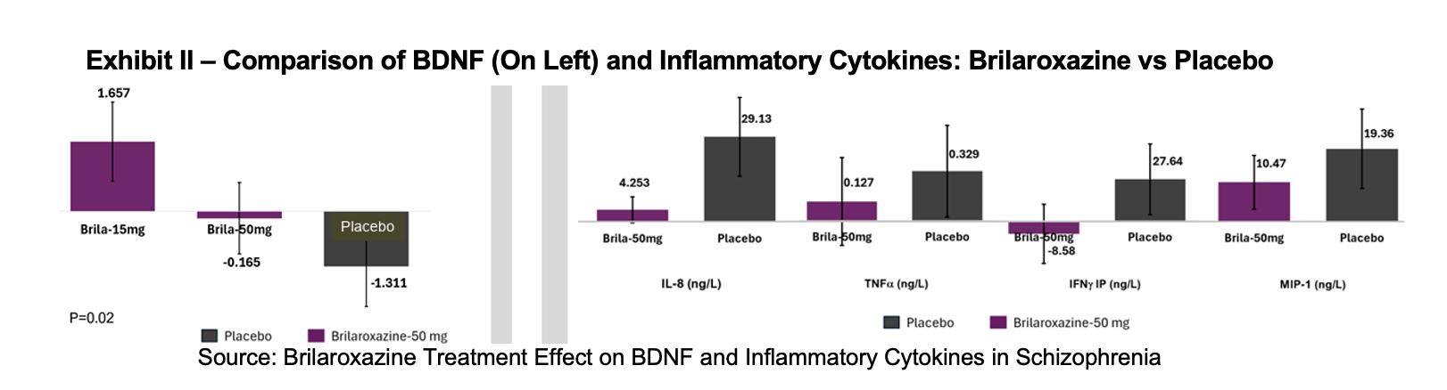 In the OLE, brilaroxazine increased BDNF by 1.83 μg/L over 52 weeks, providing durable neurotrophic support. Proinflammatory cytokines declined from baseline. In the 50 mg cohort, IL-8 fell from 29.13 to 4.25 ng/L, TNF-α from 0.33 to 0.13 ng/L, IFN-γ-IP from 27.64 to -8.58 ng/L, and MIP-1 declined from 19.36 to 10.47 ng/L.