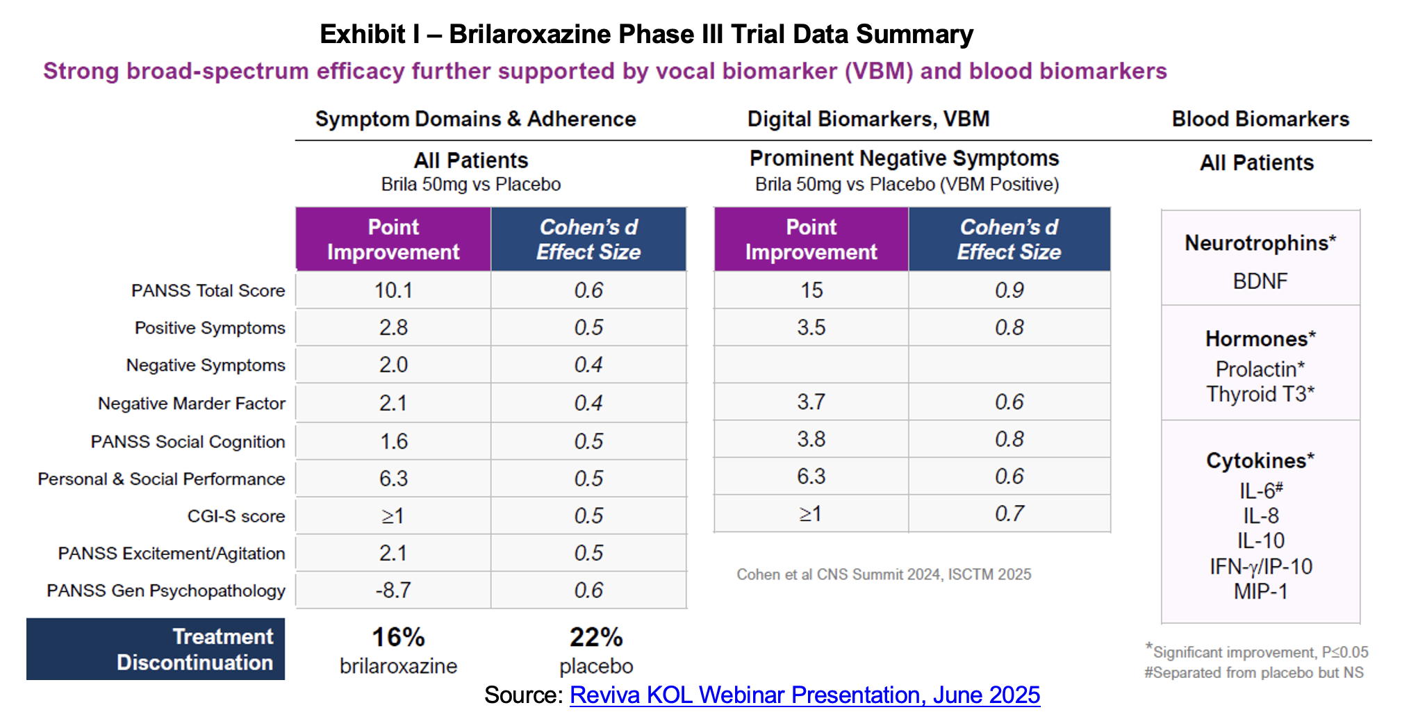 The event began with introductions of the featured KOLs and background on Reviva’s lead candidate brilaroxazine. Four trials have been run for brilaroxazine including a Phase Ia/Ib, the Phase II REFRESH trial, Phase III RECOVER trial and the OLE. The trials have evaluated 15, 30 and 50 mg doses of brilaroxazine of periods ranging from four weeks to 12 months. The drug is being developed to treat schizophrenia, a psychiatric condition that affects over 1% of the world population and an estimated 24 million people globally and 3.5 million in the United States. While there are many approved compounds to treat schizophrenia, there are also several shortcomings. Two of the most salient include addressing negative symptoms such as avolition and asociality and adherence to treatment which is impacted by unpleasant side effects.