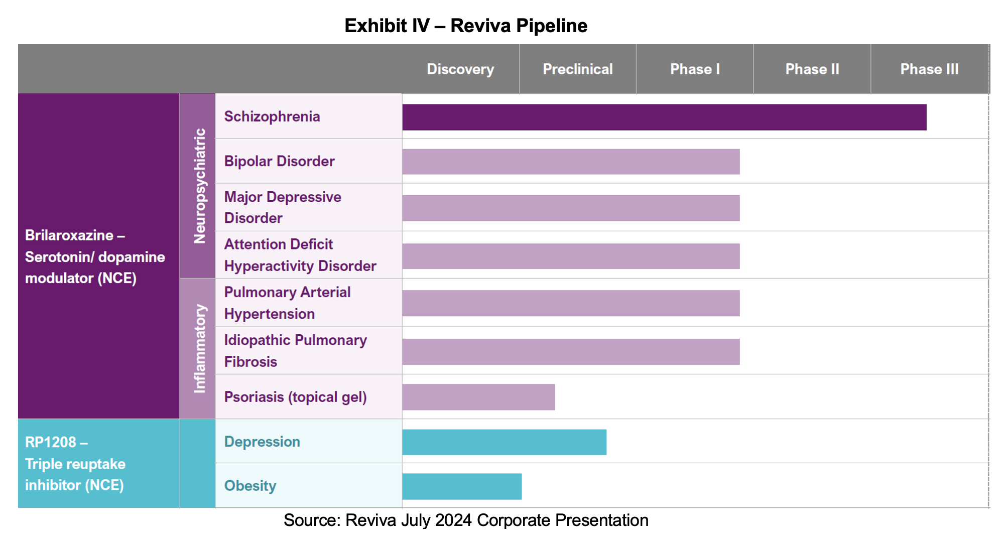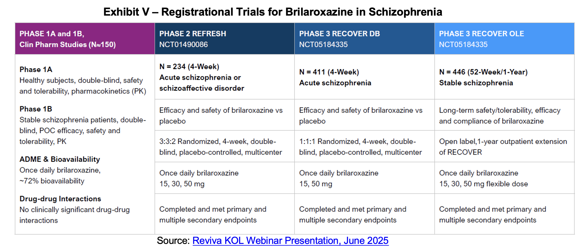 Reviva is exploring the possibility of generating a new drug application (NDA) with existing data. The company has conducted a large Phase II, a Phase III and a safety study for brilaroxazine in schizophrenia. Others schizophrenia drug developers have submitted to the FDA with only one Phase III including Minerva Neurosciences with roluperidone and Intra-Cellular Therapies with Caplyta. We expect to hear additional details on this alternative in the near term following a potential FDA meeting. Skipping the second RECOVER trial would be a substantial positive for shareholders and would eliminate the overhang related to the near term capital raise necessary to run RECOVER 2.