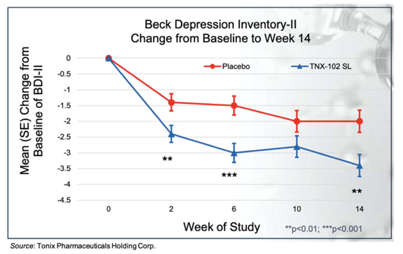 The support for evaluating TNX-102 SL as a treatment for depression stems from results of TNX-102 SL in fibromyalgia and post-traumatic stress disorder (PTSD) clinical trials. For example, in the RESILIENT Phase 3 trial, there was a greater reduction in the total Beck Depression Inventory-II score in the TNX-102 SL cohort compared to placebo at Week 14 with an effect size of 0.27, as shown in the following figure.