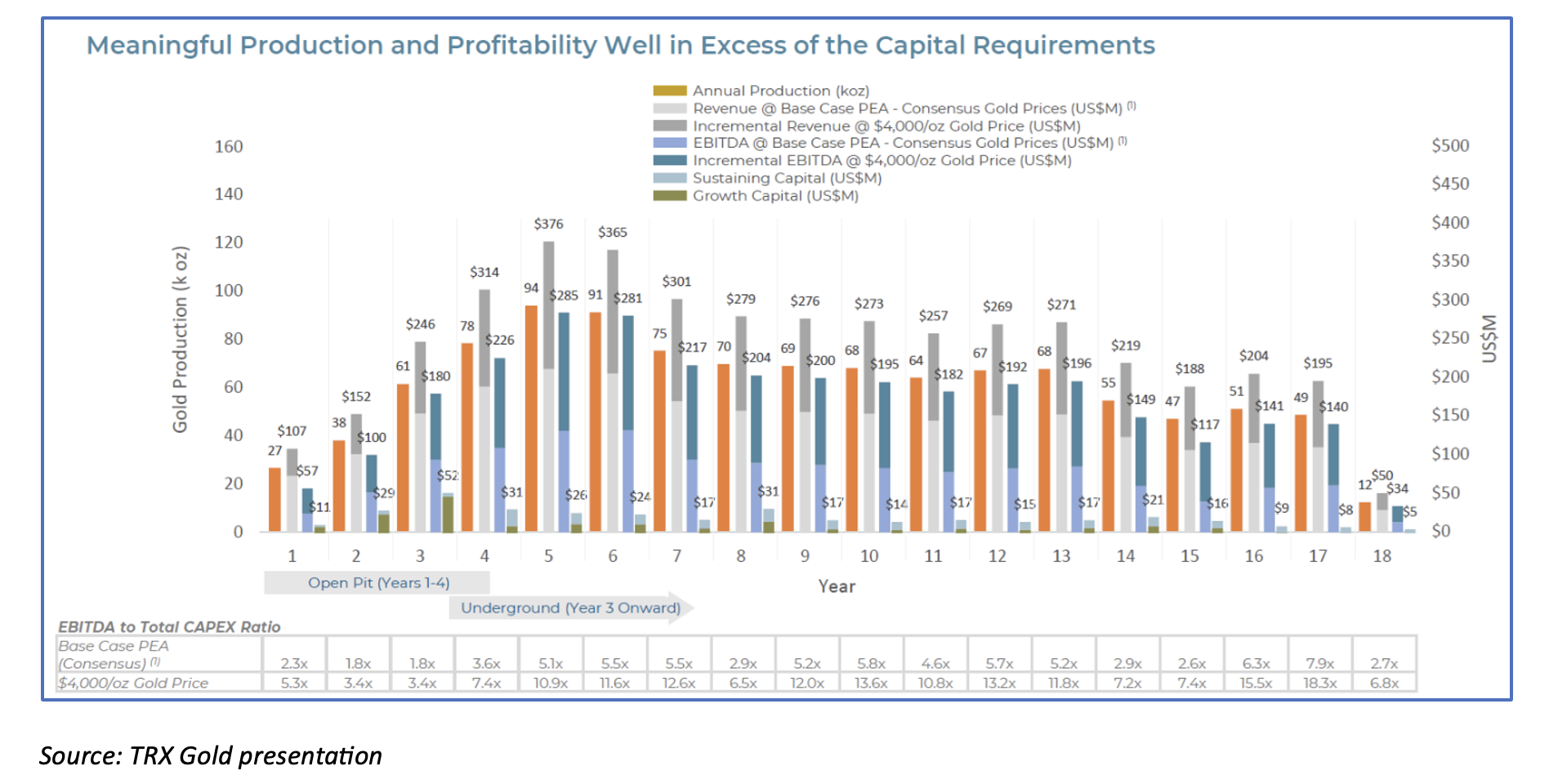 The centerpiece of TRX’s strategy is the expansion of Buckreef’s processing capacity. Management is executing a US$30 million program, fully funded from operating cash flow, to build a 3,000+ tpd sulphide circuit alongside a 1,000 tpd oxide/transition circuit. This dual‑circuit design lifts throughput beyond 4,000 tpd, exceeds the PEA baseline, and targets recoveries of 87–90%. Phased over 18–24 months, the expansion leverages existing equipment and onsite expertise, minimizing execution risk. Once complete, annual production is expected to surpass 62,000 ounces, with incremental upside from repurposed equipment contributing an additional ~10,000 ounces annually by FY2027. Peak production is expected in F2029, exceeding 100,000 ounces.