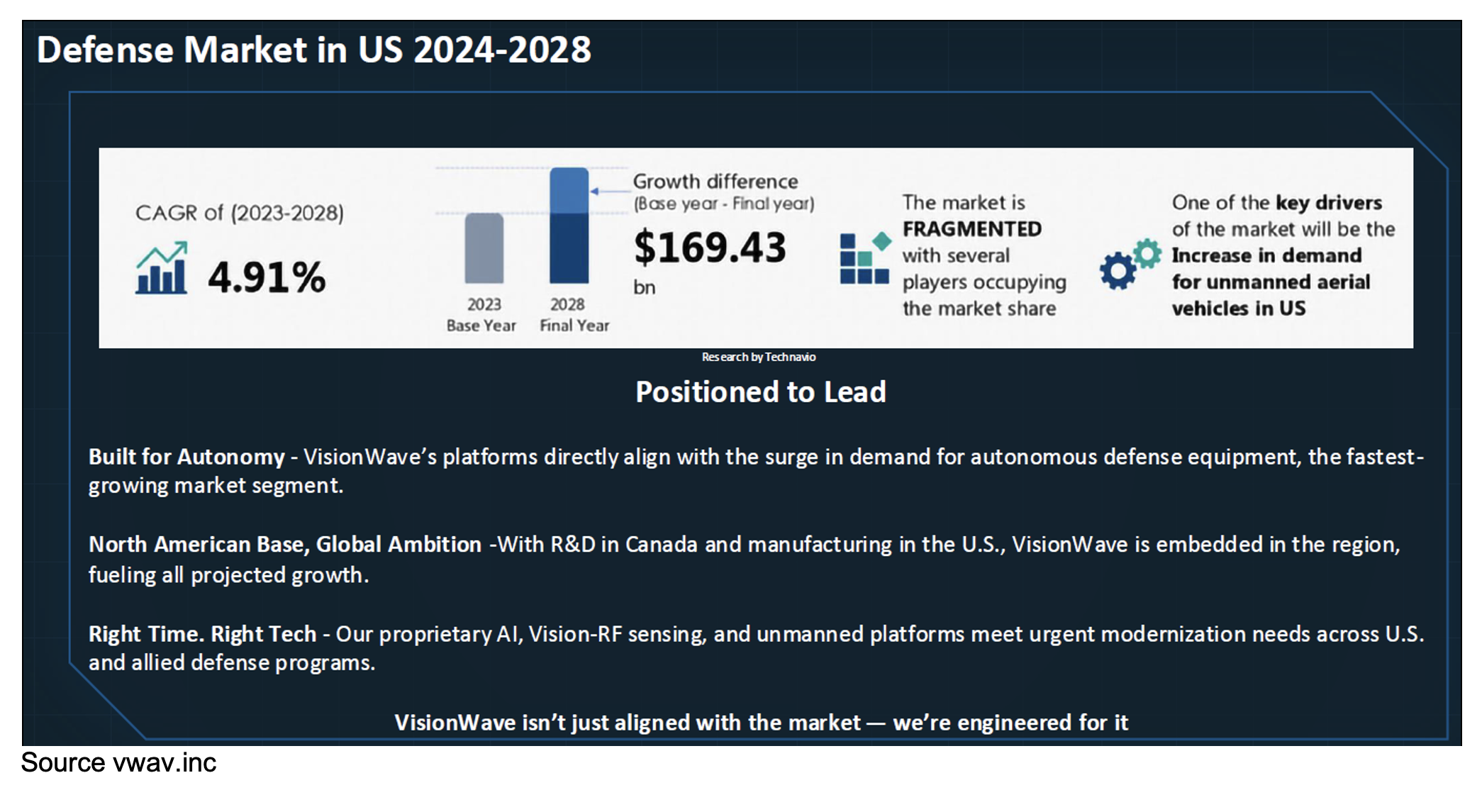 As a result, VisionWave is strategically positioned to capture share in the fastest-growing segments of the defense modernization cycle, including AI-enabled autonomy, RF-based sensing, counter-UAS, and active-protection systems. These segments represent multi-billion-dollar addressable opportunities across U.S., NATO, and allied markets which are areas where VisionWave is already engaged through pilot programs and active demonstrations.