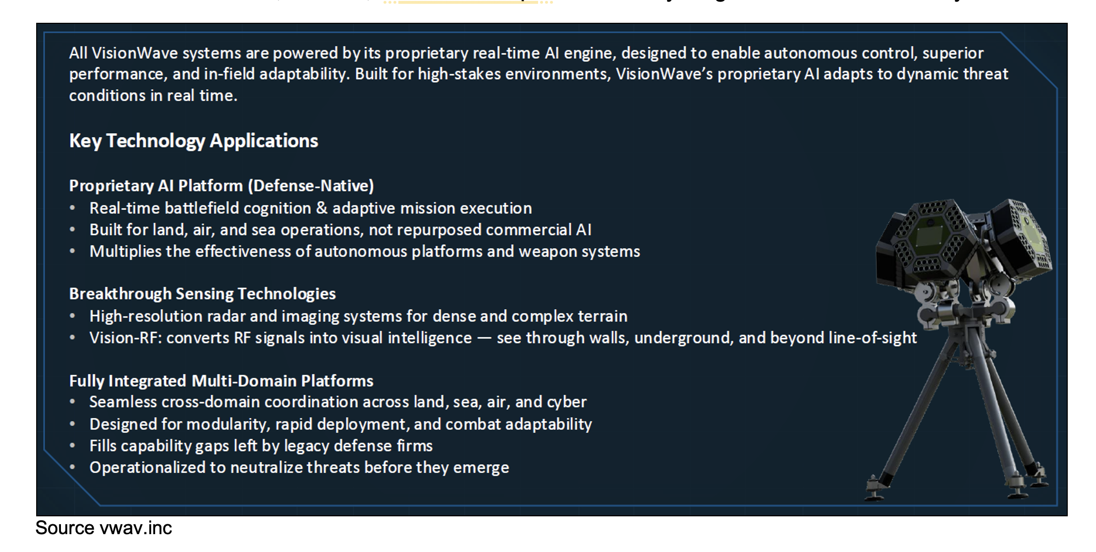 VisionWave Holdings (NASDAQ:VWAV) is redefining defense through AI-driven autonomy, advanced sensing, and multi-domain innovation. The company develops and integrates proprietary artificial intelligence, radio-frequency (RF), and vision-based systems that connect intelligent platforms and assets to create a fully coordinated defense ecosystem. These solutions enhance real-time situational awareness, surveillance, and targeting precision across air, land, and sea operations which delivers unmatched performance in the most challenging environments.