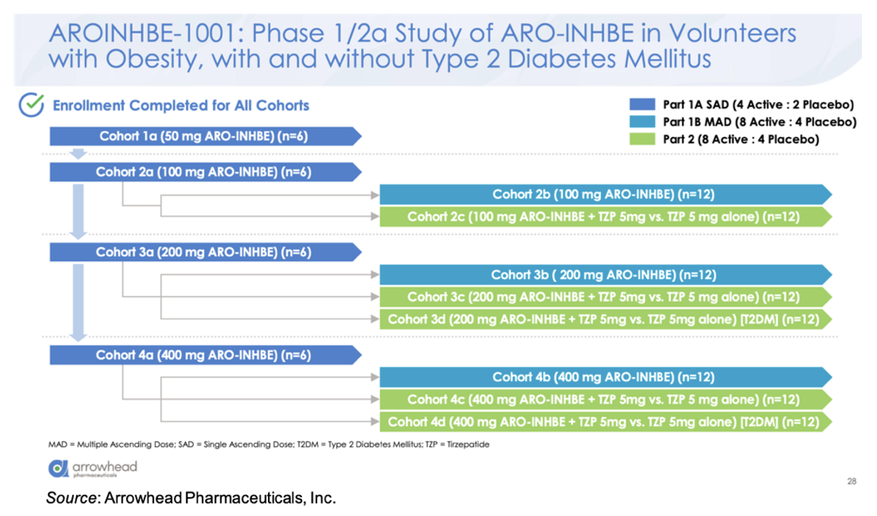 ARO-INHBE is being evaluated in the AROINHBE-1001 study. This is a Phase 1/2a clinical trial in obese volunteers both with and without type 2 diabetes (T2D). An overview of the trial is given below. Part 1 of the trial is designed to test single and multiple doses of the drug as a monotherapy. Part 2 of the study is designed to assess ARO-INHBE in combination with tirzepatide. Enrollment has been completed for all cohorts. The primary endpoints for the study are safety and pharmacokinetics, with exploratory endpoints evaluating serum Activin E levels, weight change, body composition, liver fat content (MRI-PDFF), fasting lipids, and glycemic control parameters.