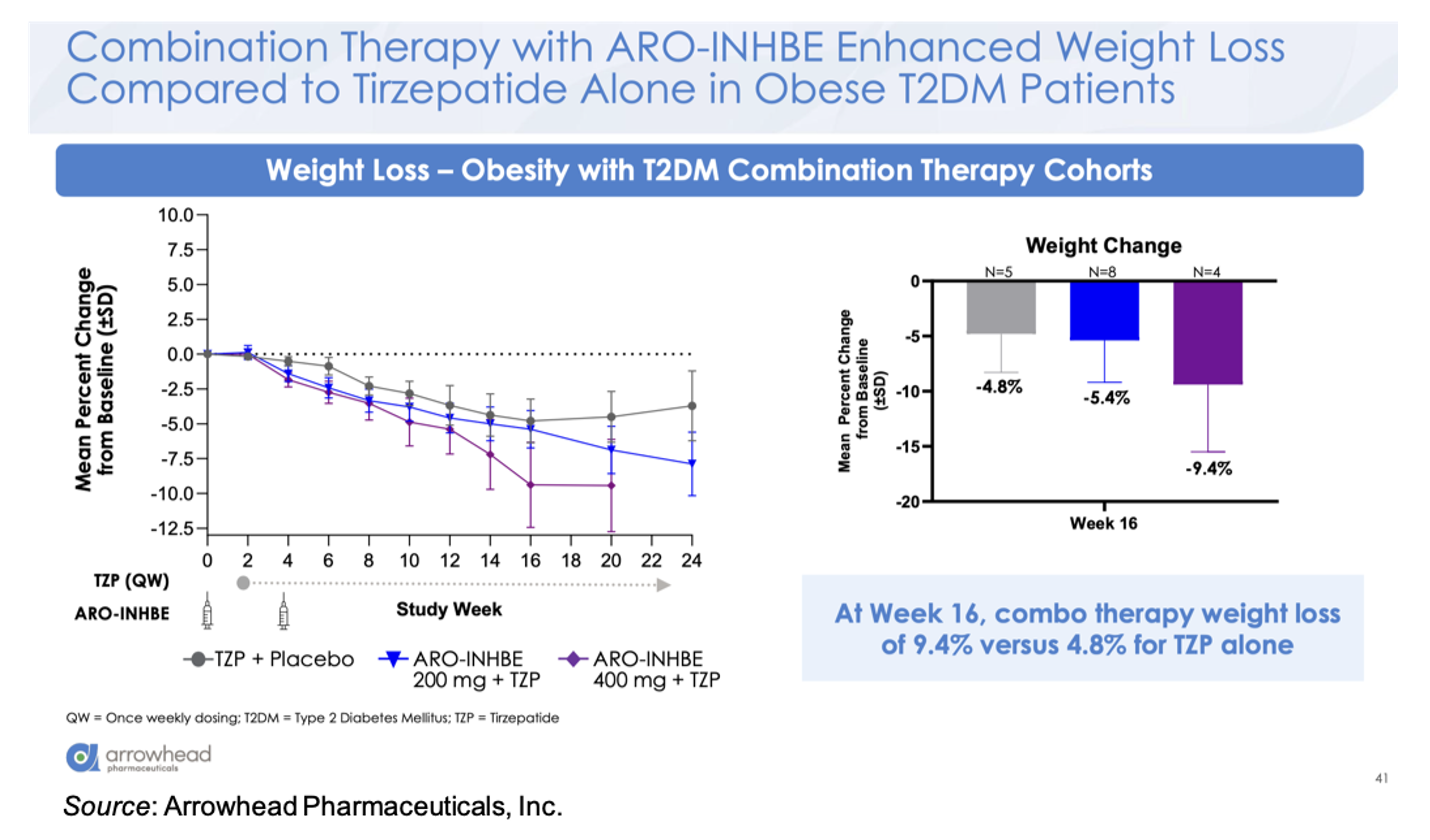 For the combination cohort (tirzepatide 5 mg weekly + ARO-INHBE 200 mg, ARO-INHBE 400 mg, or placebo at Week 0 and Week 4), the company presented the data for the T2D cohort and will share the data for the non-diabetic cohort at a later date. The combination therapy decreased serum Activin E levels up to 84% in the T2D cohort, while no decrease in Activin E was seen in the tirzepatide monotherapy cohort. At Week 16, the 400 mg ARO-INHBE + 5 mg tirzepatide group showed a weight change of -9.4% compared to -4.8% for the placebo + 5 mg tirzepatide cohort.