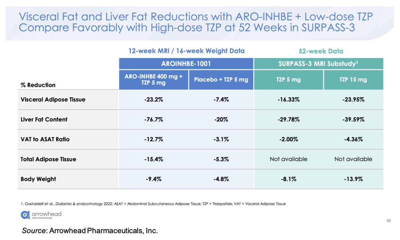 Compared to 5 mg tirzepatide alone, there was an approximately three-fold enhancement in loss of visceral adipose tissue, total adipose tissue, and liver fat content in the ARO-INHBE 400 mg + 5 mg tirzepatide. Interestingly, these reductions at Week 12 (MRI data)/Week 16 (Weight data) are on track to meet or exceed the Week 52 data seen in the SURPASS-3 MRI-substudy (Gastaldelli et al., 2022).