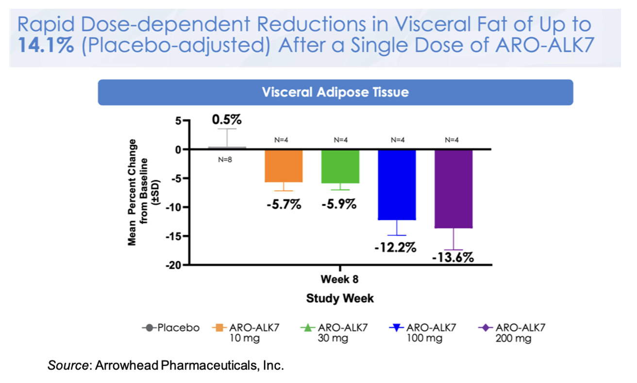 This knockdown of ALK7 mRNA translates to a placebo-adjusted dose-dependent reduction in visceral fat at Week 8 of up to 14.1% after a single dose of ARO-ALK7. These very early data may be alluding to greater activity in ARO-ALK7 compared to ARO-INHBE, however additional data will need to be collected to support that observation. Preliminary safety data also shows that ARO-ALK7 has been well tolerated as a monotherapy, with most TEAEs being mild in severity and no TEAEs leading to study or study drug discontinuation.