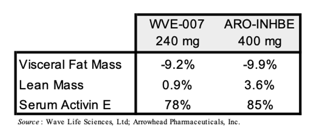 Wave Life Sciences, Ltd. (WVE) is developing WVE-007 (INHBE GalNAc-siRNA) as a treatment for obesity. Just like ARO-INHBE, it is designed to silence the INHBE gene. Wave is currently evaluating WVE-007 in the Phase 1 INLIGHT trial and recently announced interim data from the lowest dose cohort. The data showed that a single 240 mg dose of WVE-007 lead to a placebo-adjusted 9.2% reduction in visceral fat, a 4.0% reduction in total body fat, and a 0.9% increase in lean mass as measured by DEXA scan at Day 85. A table with the WVE-007 and ARO-INHBE data is presented below.
