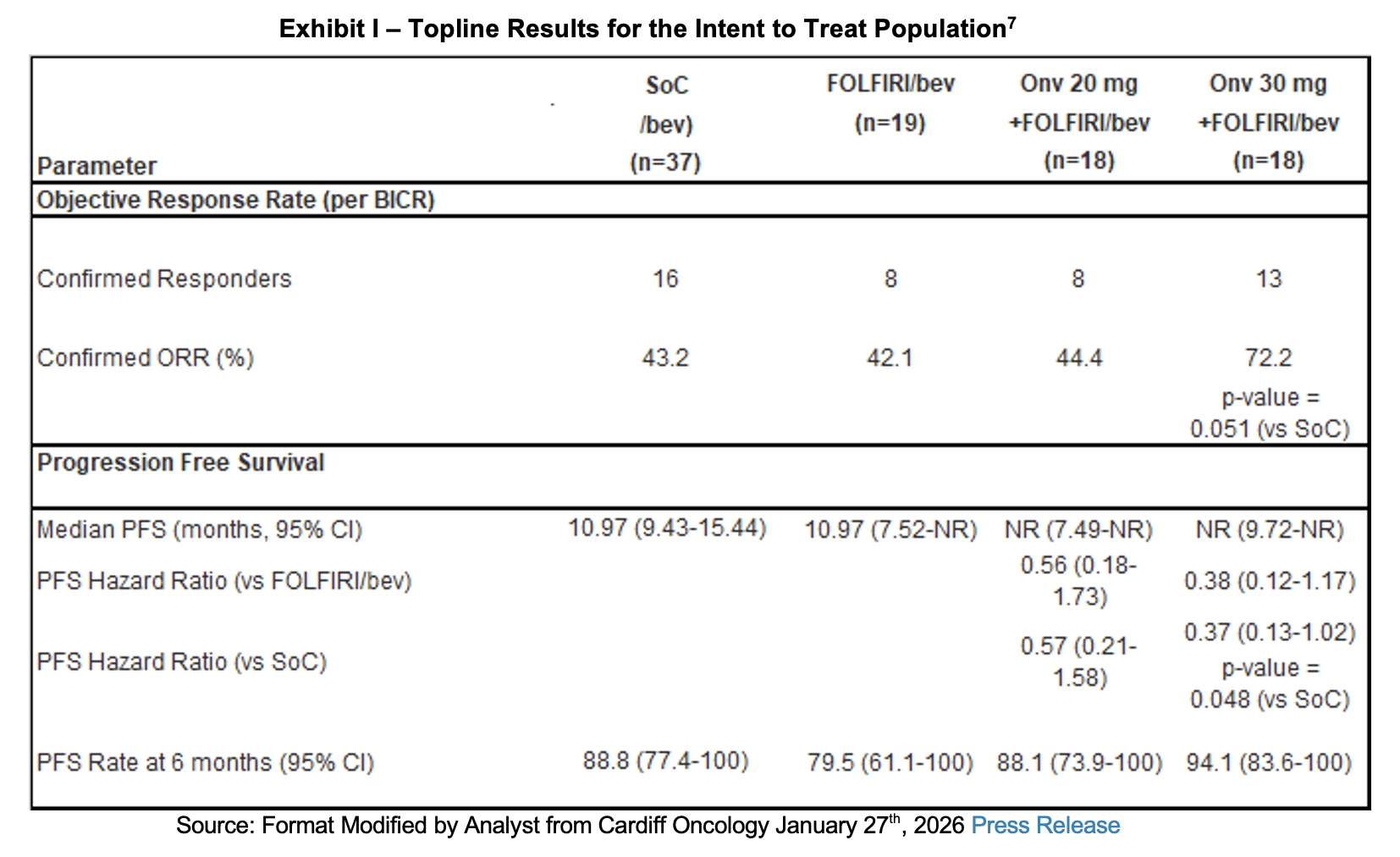 In a January 27th press release, Cardiff reported select data from its CRDF-004 Phase II trial of onvansertib, demonstrating dose-dependent response rates for overall survival and durability as measured by progression-free survival (PFS) in patients with RAS-mutated mCRC. Data released includes overall response rates (ORR), median PFS, and the associated Hazard Ratio (HR). Final data and registrational plans are planned to be released in 1H:26.