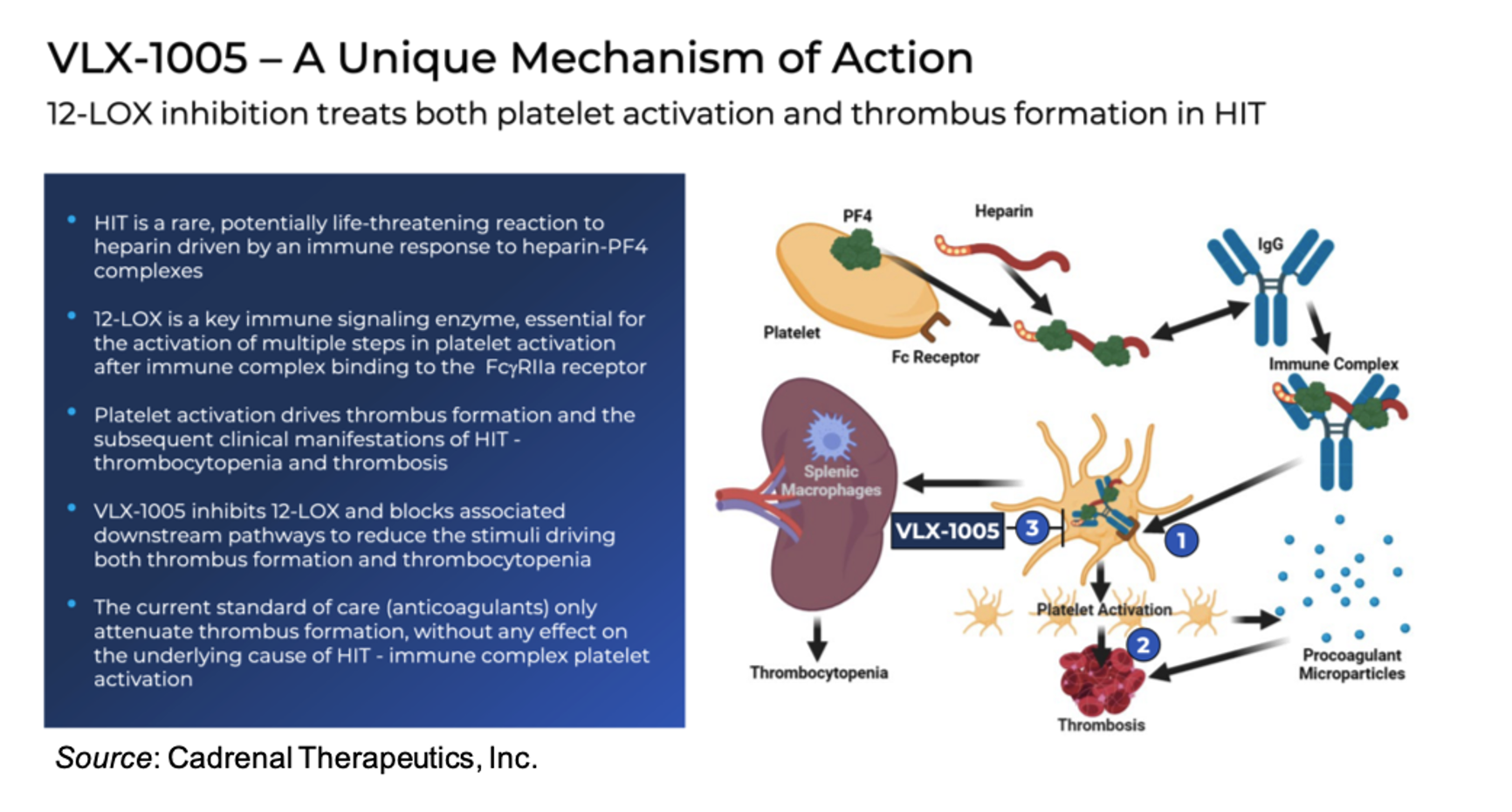 Current management of HIT relies on alternative anticoagulants, which address clot formation but do not target the upstream immune mechanism. CAD-1005’s inhibition of 12-LOX is designed to interrupt the immune signaling cascade responsible for platelet activation on thrombus propagation. The divergence between platelet recovery and thrombotic outcomes in the Phase 2 trial further reinforces the importance of targeting the underlying immune driver (which CAD-1005 does) rather than focusing solely on platelet counts.