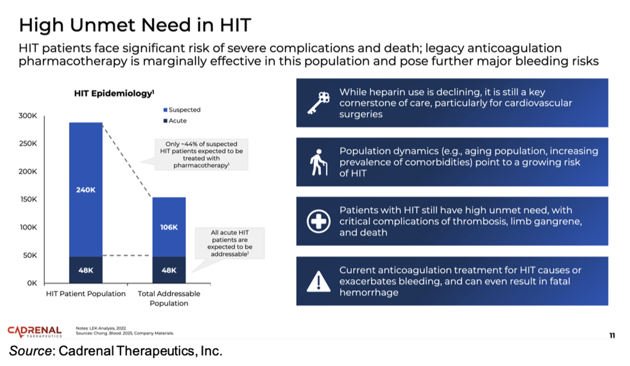 Currently approved HIT treatments focus on non-heparin anticoagulation, which mitigate clot propagation but do not directly modulate immune platelet activation, which is the core driver of HIT pathology. Thus, there is a high residual risk of thrombosis that persists in HIT patients despite anticoagulant therapy. In addition, there are no approved agents that target the immune-mediated platelet activation pathway, thus positioning CAD-1005 as a first-in-class drug. There are approximately 240,000 suspected cases and approximately 48,000 confirmed cases of HIT in the U.S. each year, thus offering a large patient population that could potentially benefit from a safe and effective HIT therapy.
