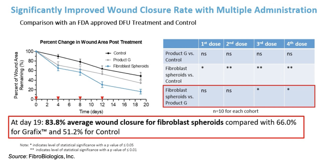 FibroBiologics has compiled a robust pre-clinical data set showing the efficacy of fibroblast spheroids in the treatment of wounds. For example, the following figure shows results using a diabetic mouse model in which administration of fibroblasts led to a statistically significant average 83.8% wound closure by Day 19 compared to 66.0% for Grafix™ and only 51.2% for control.