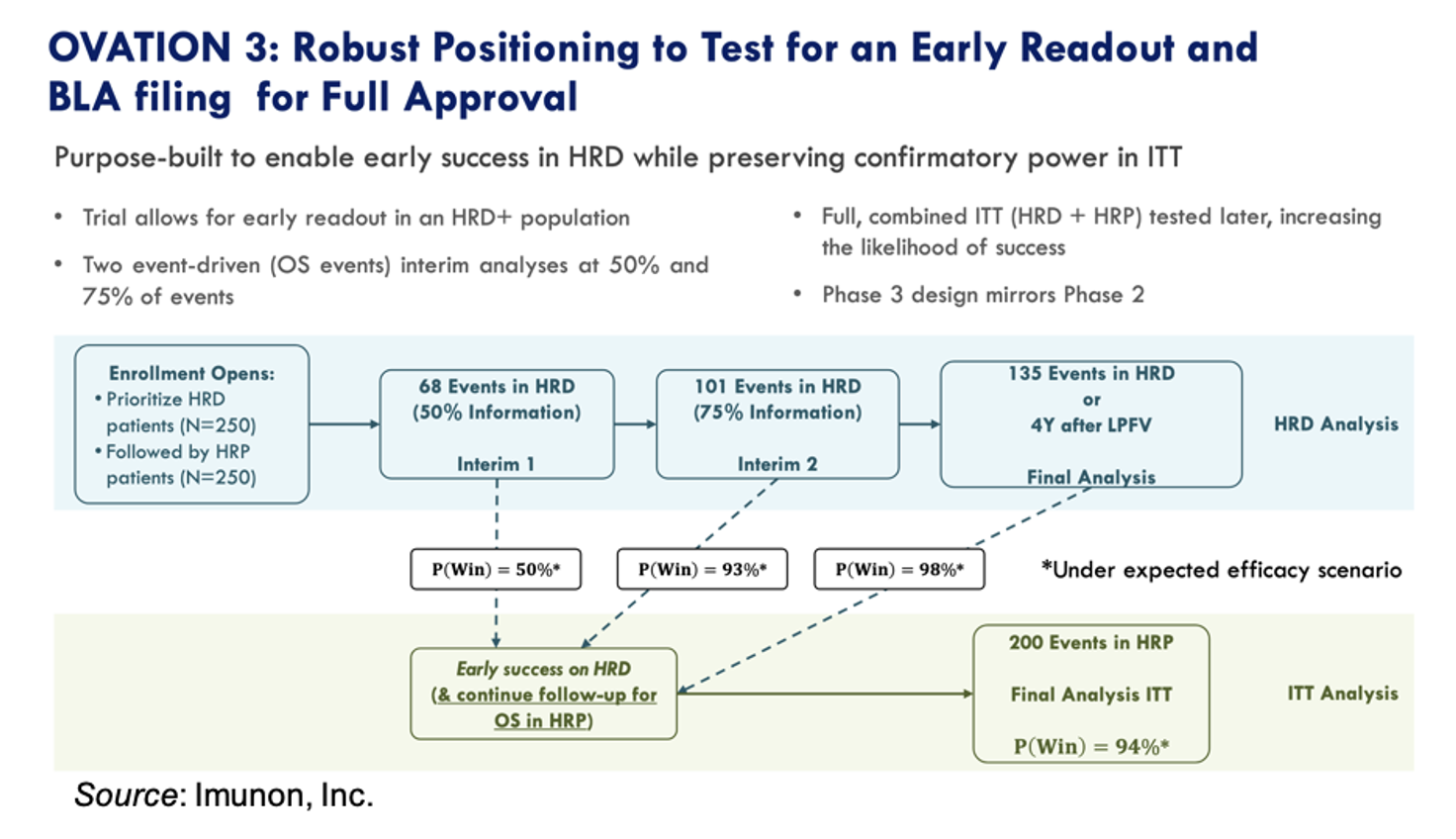 The OVATION 3 trial has been designed to prioritize the enrollment of HRD+ patients and has two interim analyses at 50% and 75% of events. The trial has 98% power to detect a statistically significant increase in overall survival in the HRD+ population, with a probability for stopping early for success at the interim readout of >90%.