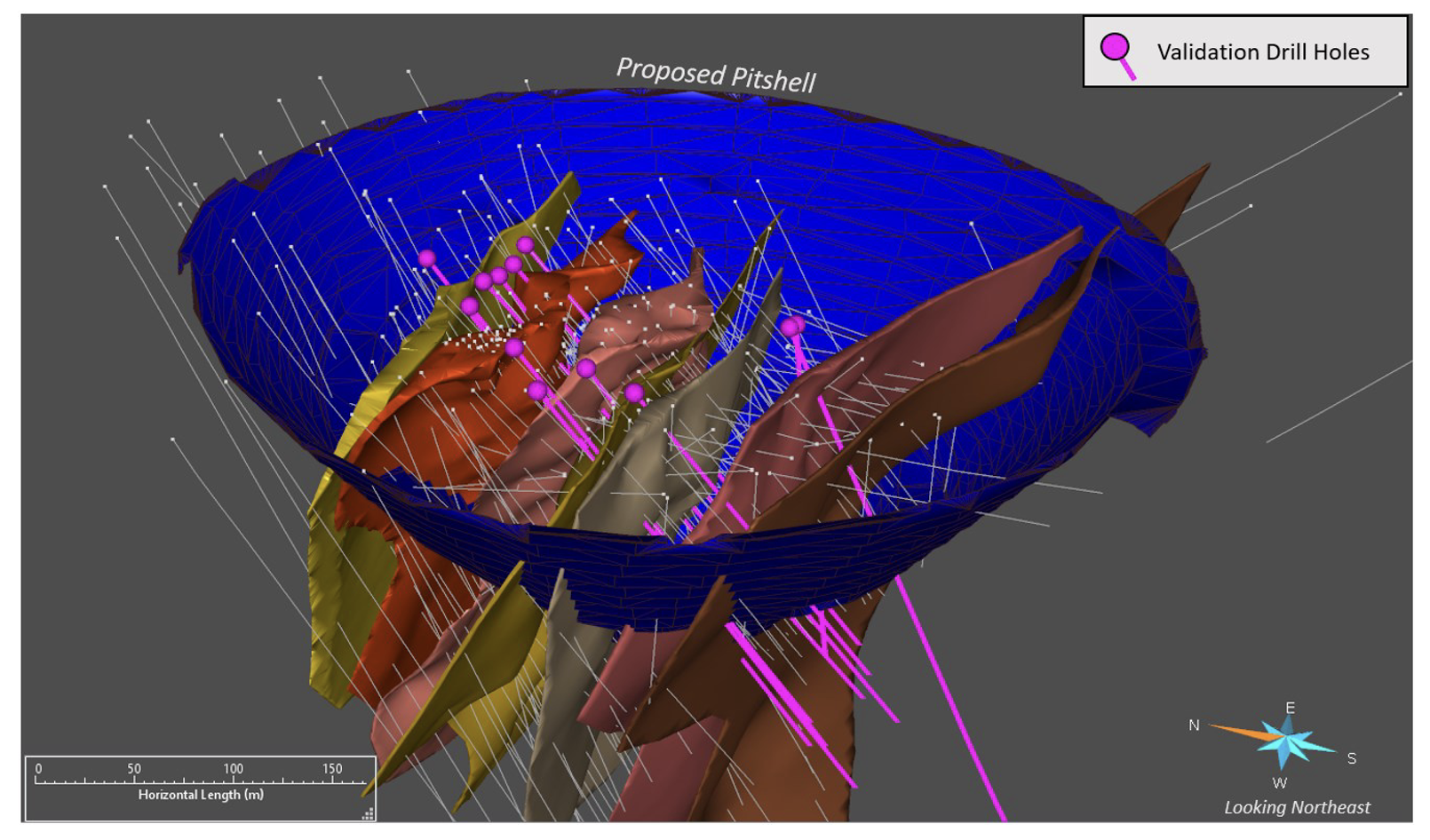 The updated mineral resource estimate provides further support for the development plan. Indicated ounces increased by 30% following confirmation drilling and lower cut‑off grades, bringing the total to 160,000 ounces indicated and 67,000 ounces inferred. Importantly, most of the indicated resource sits within the optimized pit shell, supporting several years of low-cost open-pit mining before transitioning to underground potential. The mineralized footprint—475 metres by 425 metres by 500 metres—remains open in all directions, and ongoing drilling continues to demonstrate extensions at depth, on strike, and internally within the deposit.