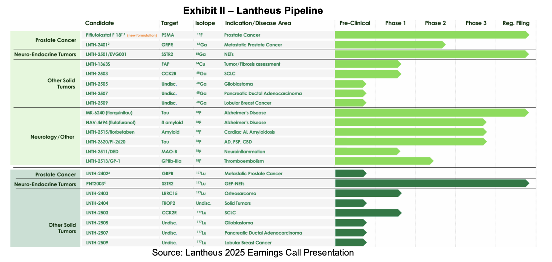 At the beginning of the year, prior Chairperson of the Board and former CEO, Mary Anne Heino, returned as the chief executive following the retirement of Brian Markison. Her return ushers in a new strategic focus to prioritize investment in the development and commercialization of innovative PET radiodiagnostics, alongside a decision to pursue value‑maximizing alternatives for radiotherapeutic assets to support long‑term growth. We interpret this to mean Lantheus will prune some early-stage therapeutic assets. Since the third quarter update, the company has divested its SPECT business to SHINE Technologies, expanded its PET portfolio with the addition of the NeuraCeq franchise and submitted three assets to the FDA for which target action dates have been assigned.