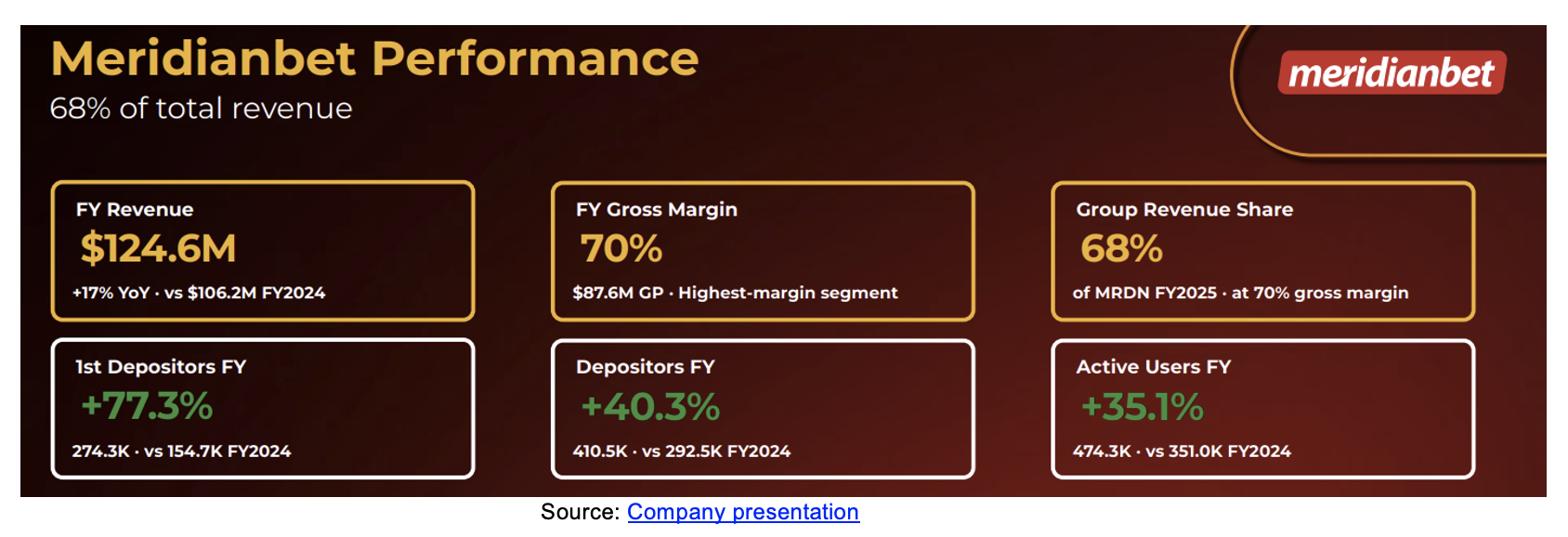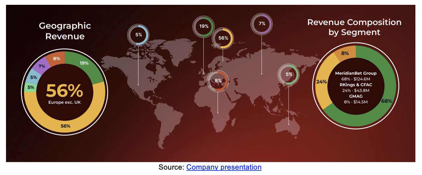 Meridianbet Group segment revenue grew 17% year-over-year in 2025 to $124.6 million, representing 68% of total revenue. The segment gross margin was roughly 70%. In the Meridianbet Group segment. Expanse Studios develops proprietary gaming content for 1,344 operators across North America, Europe, Latin America, Africa, and Asia. Its operator network grew 630% year-over-year in 2025, contributing to 4Q25 year-over-year revenue growth of 435%.