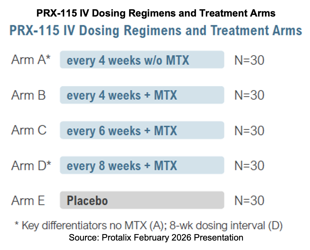 The PRX-115 Phase I study was completed in 2024, generating data that was presented at conferences, including ACR Convergence. Results from the trial supported advancement to the next stage of development. Planning for the PRX-115 Phase II trial was conducted during 2025, and an investigational new drug (IND) application was filed with the FDA in October. It was cleared in November, and the Phase II started shortly after, enrolling subjects in 1Q:26.