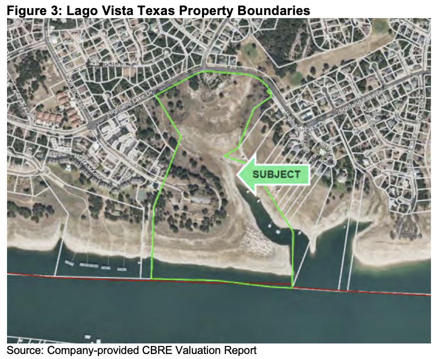 ▪ Lago Vista, Texas: Roughly a 59-acre site on Lake Travis outside of Austin, Texas.