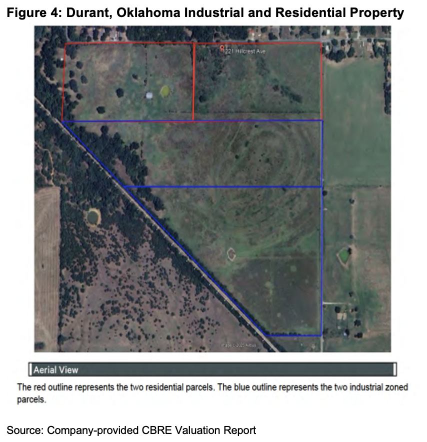 CBRE appraised the Lago Vista, Texas, property at $6.4 million ($108k per acre) and the Durant, Oklahoma, property was valued at $3.5 million (approximately $31k per acre) in June 2025 for a combined value of $9.9 million of real estate assets.