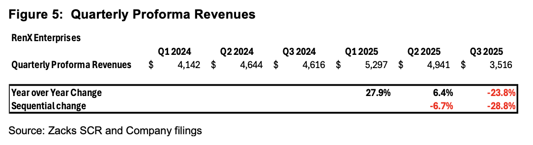 - In November, the company reported its first full quarter of operations after the acquisition of the Resource Group. While the headline revenue number was impressive at $3.5 million (up more than 4,000% from actual results in the same quarter of 2024), it is important to note that this is not an apples-to-apples comparison, as the acquisition of Resource Group in the second quarter meant that the results for the quarter included Resource Group for the first time. By reviewing the quarterly pro forma results disclosed in RenX's (then Safe and Green Development) 10-Qs, we can get a clearer picture of the company's revenue patterns.