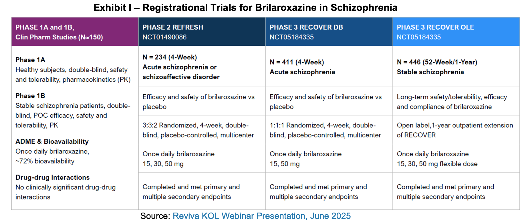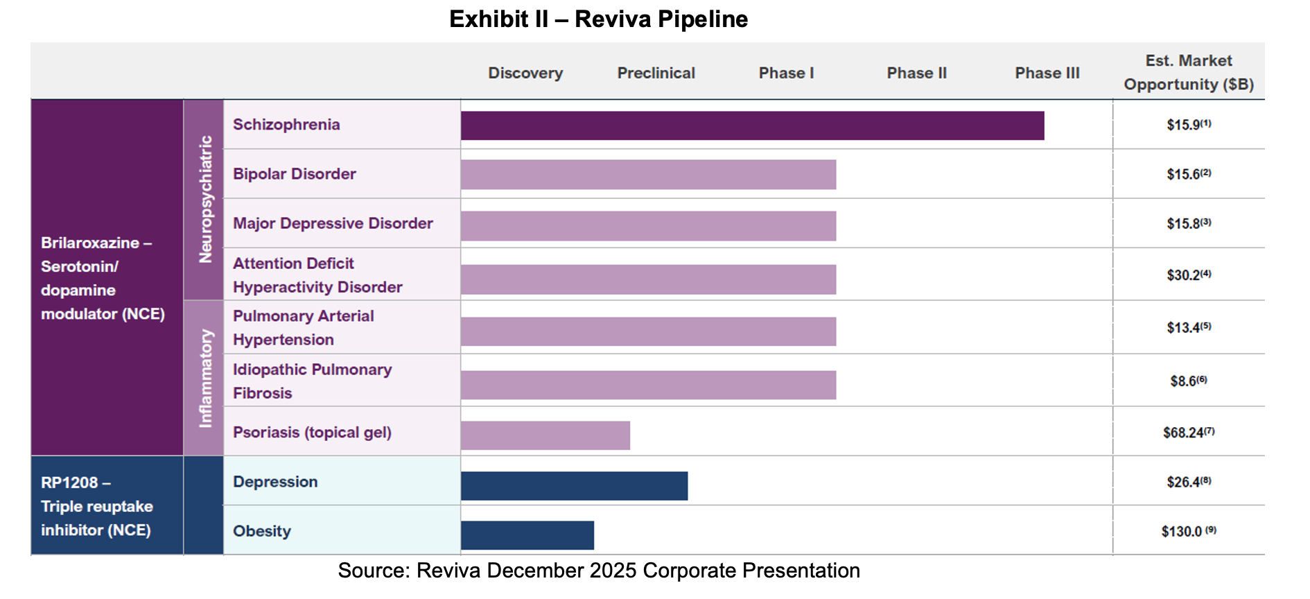 Reviva had explored the possibility of submitting an NDA supported with data from its Phase II and first Phase III study. However, in a written response provided to Reviva in December, the FDA recommended that a second Phase III study be conducted for brilaroxazine in patients with schizophrenia to generate additional efficacy data and expand the safety dataset. This response eliminated the possibility that the NDA could be filed with existing data. The FDA further provided Reviva with guidance for methods of data analysis, methods of data presentation, and data requirements for studies of animal pharmacokinetics, human abuse potential, and renal and hepatic impairment.