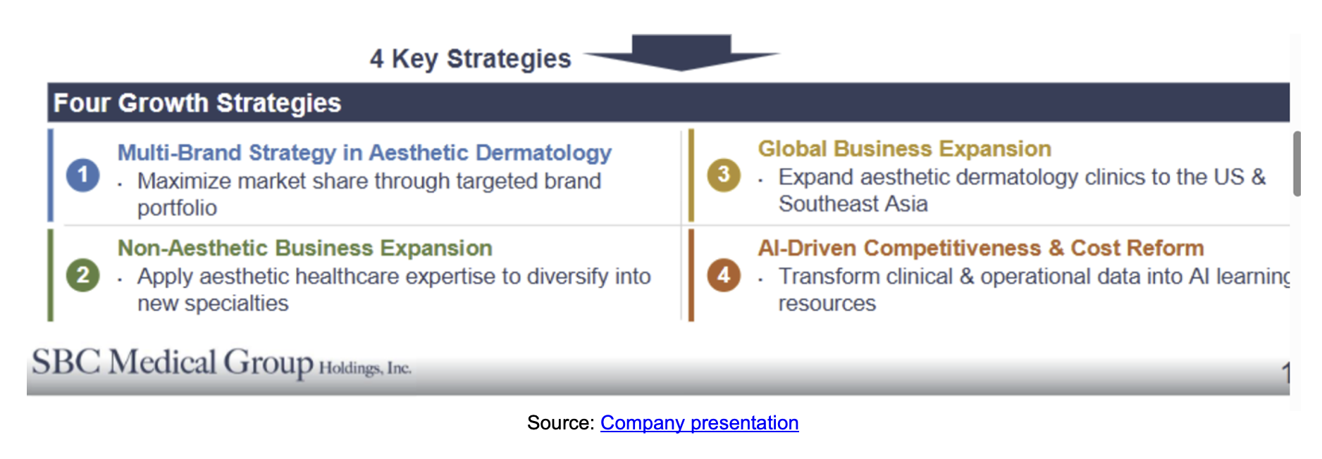 In addition, SBC launched a multi-brand strategy in aesthetic dermatology and other areas to address the increasingly diverse needs of its growing customer base to customize services across multiple brands, segment the market, and garner more market share overall. SBC has also increased its focus on many non-aesthetic specialties where it believes it has substantial opportunities to grow and gain more market share. Reflecting these and other changes and improved product mix, average revenue per customer visit has begun to recover and improve. The company expects efforts will continue to diversify revenue sources. SBC also sees international expansion, focused on the U.S. and Southeast Asia, as integral to creating long-term value. By 2027, the company expects to operate a significantly larger global footprint offering diversified medical services, with an emphasis on aesthetic medicine.