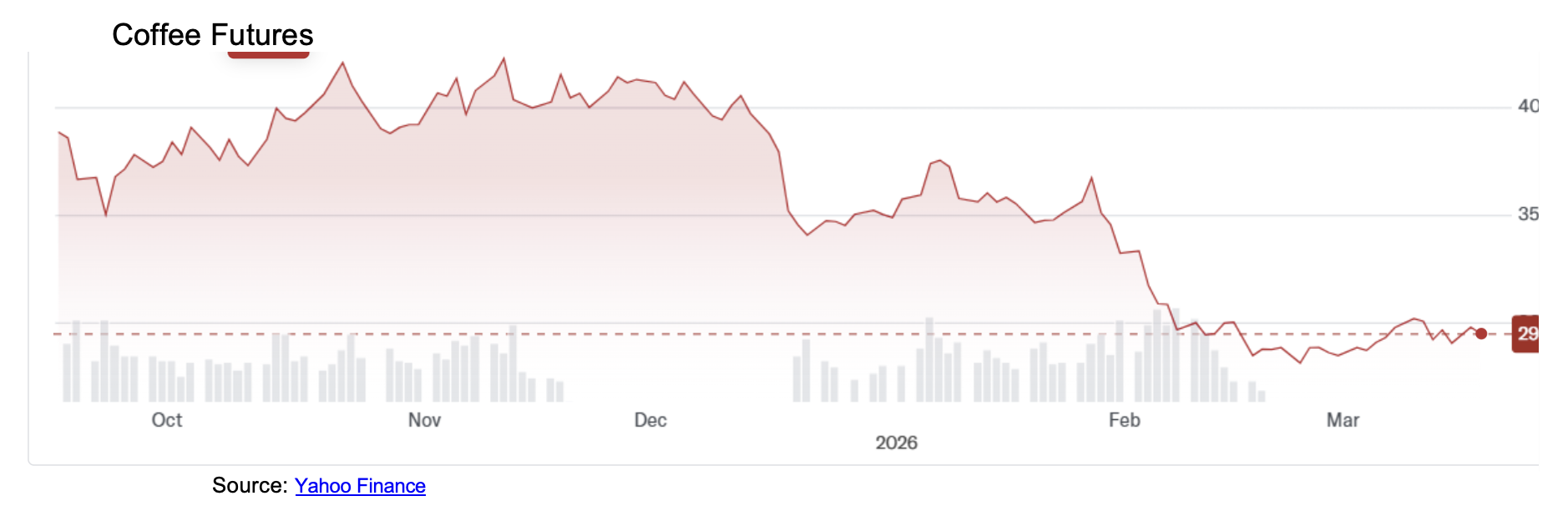 Prices now appear to be declining, according to Trading Economics, which notes that over the month of February 2026, coffee prices have fallen by double-digit percentages compared to the same period in 2025. In fact, Arabica coffee futures approached their lowest level since November 2024. The supply outlook has improved, with a strong crop expected in the next (2026-2027) season. The National Supply Company (Conab) anticipates a significant increase in Brazilian supply, forecasting a 17+% increase in 2026 compared to 2025, with Arabica production up an anticipated 23+%.
