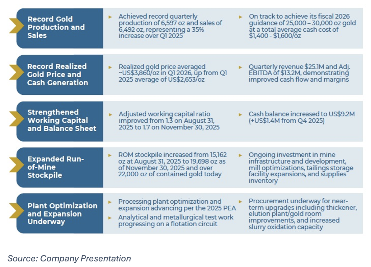 Quarterly production reached a new high of 6,597 ounces, supported by sustained access to higher-grade ore and stable plant performance. Revenue increased to $25.1 million, gross profit rose to $14.2 million (57% margin), and EBITDA reached $13.2 million (53% margin). Year‑over‑year comparisons highlight the scale of improvement: revenue more than doubled, EBITDA tripled, and margins expanded sharply. Sequentially, TRX also improved across most key metrics relative to Q4 2025, including higher pours, stronger margins, and increased revenue. Management reaffirmed fiscal 2026 production guidance of 25,000–30,000 ounces.
