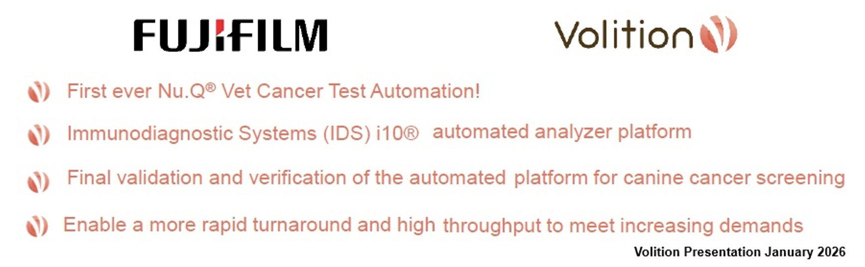 On March 6, 2026, Volition announced the completion of validation & verification of chemiluminescent immunoassay (ChLIA) version of Nu.Q Vet Cancer Test with Fujifilm Vet Systems in Japan, which allows for full automation rather than manual plates in central laboratories. Under a supply agreement with Volition, Fujifilm Vet Systems may sell and perform the Nu.Q Vet Cancer Test throughout its network (10 bases) of central reference laboratories in Japan. In addition, FujiFilm Vet Systems has relationships with an estimated 11,000 Japanese veterinary medical facilities. Furthermore, there are over 1,700 Japanese veterinary hospitals registered to use the Nu.Q Vet Cancer Test.