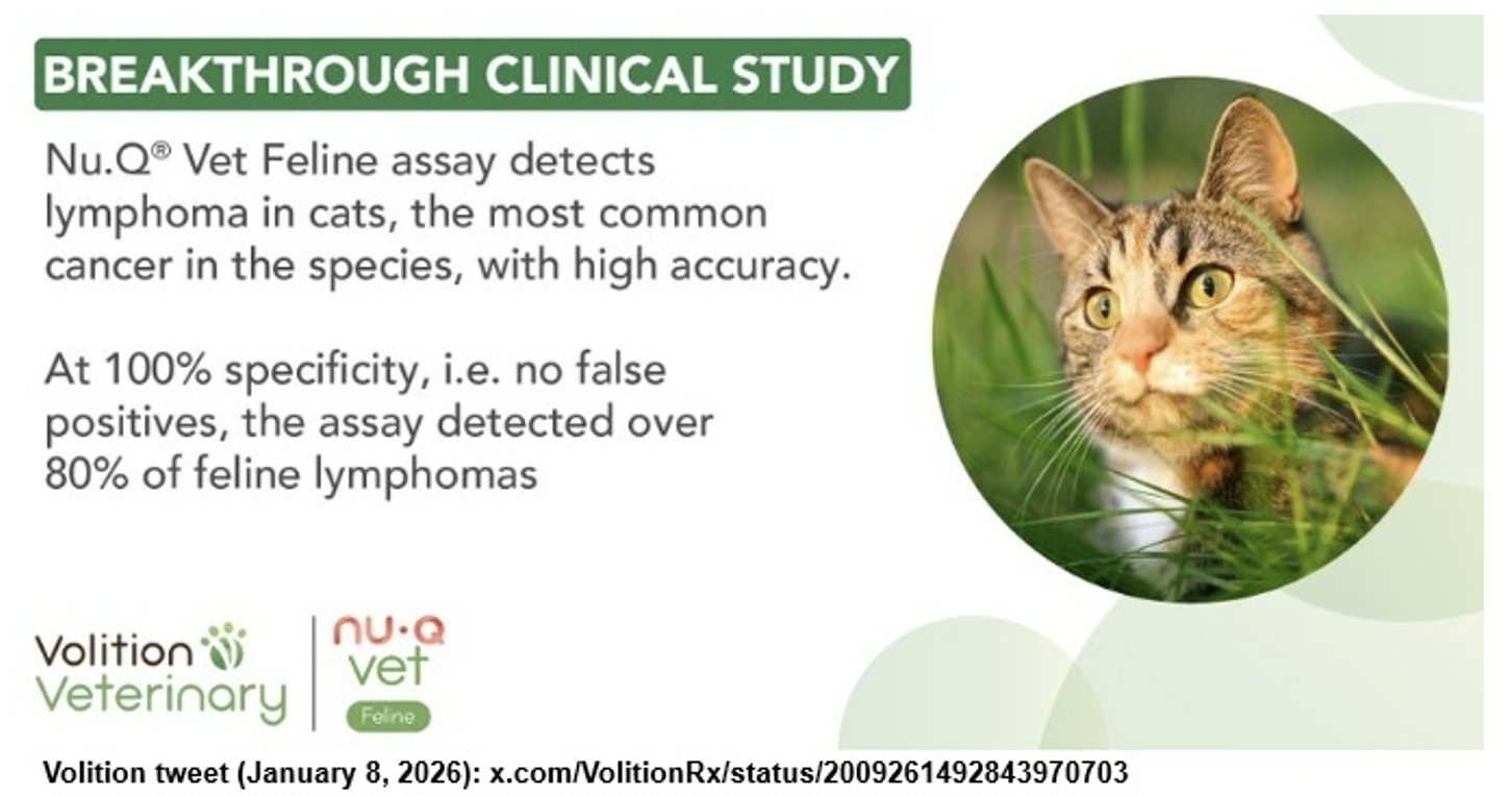 In January 2026, Volition both exhibited and sponsored a symposium at the Veterinary Meeting and Expo (VMX) in Orlando, Florida that was held between January 17-21, 2026. VMX is considered to be the premier global veterinary education conference, since around 20,000 veterinary professionals attend and it offers over 1,200 hours of continuing education (CE) programs. The Volition Veterinary Diagnostics Development team was available at booth 2243X and Dr. Sue Ettinger, DVM, DACVIM (Oncology), presented a program titled "Utilizing the Nu.Q® Vet Cancer Test in Practice" on January 19th.