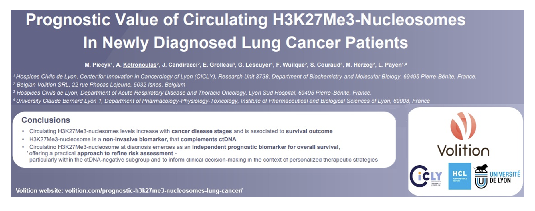 Lung Cancer Poster: The poster titled: “Prognostic Value of Circulating H3K27Me3-Nucleosomes In Newly Diagnosed Lung Cancer Patients” by M. Piecyk et al relayed results from a large-scale (n=617) study at the Claude Bernard University and Hospices Civils de Lyon in France. The study demonstrated that levels detected in the Nu.Q-H3K27Me3 assay can be a practical risk assessment tool since the levels increase with cancer disease stages, including being a prognostic biomarker for overall survival.