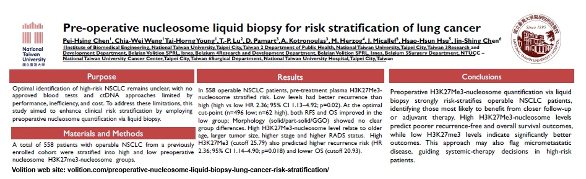 Lung Cancer Poster: The poster titled: “Pre-operative nucleosome liquid biopsy for risk stratification of lung cancer” by Dr. Pei-Hsing Chen et al relayed results from a large-scale (n=558) from a study at the Institute of Biomedical Engineering at the National Taiwan University in Taipei City. The study indicated that pre-operative H3K27Me3-nucleosome levels helps identify which Non-Small Cell Lung Cancer patients. Low H3K27me3 levels indicated significantly better outcomes than those patients with high H3K27Me3-nucleosome levels, which were flagged as higher-risk patients that would benefit from closer follow-ups and possibly secondary cancer treatment due to a higher incidence of micro-metastatic disease, along with lower survival outcomes.